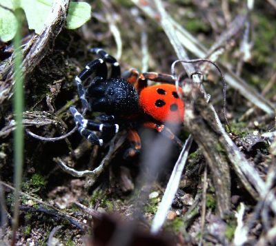 >> Männchen von Eresus niger. Diese wunderschöne Röhrenspinne zählt in Deutschland zu den größten Seltenheiten. Das Bild entstand am 26.08.2006 in der Rotenwand bei Bad Münster/Nahetal.